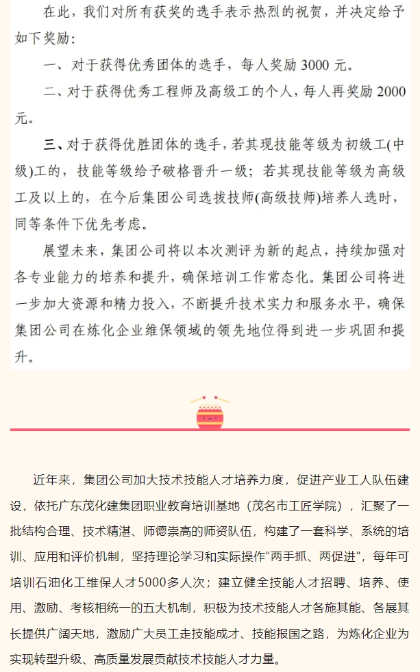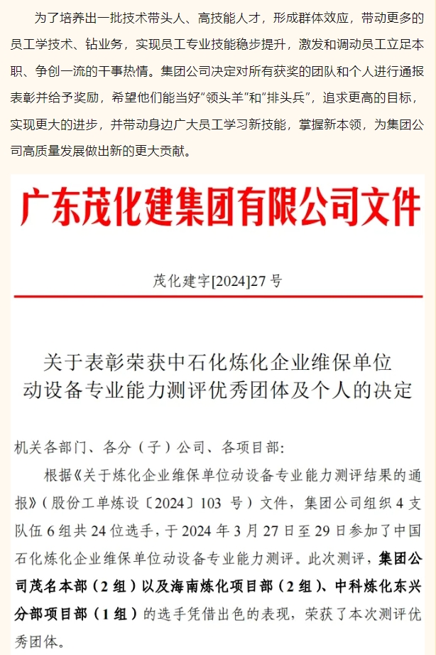 祝賀!茂化建在中石化煉化企業維保隊伍動設備實操能👾力測評中成績優異,名列前茅